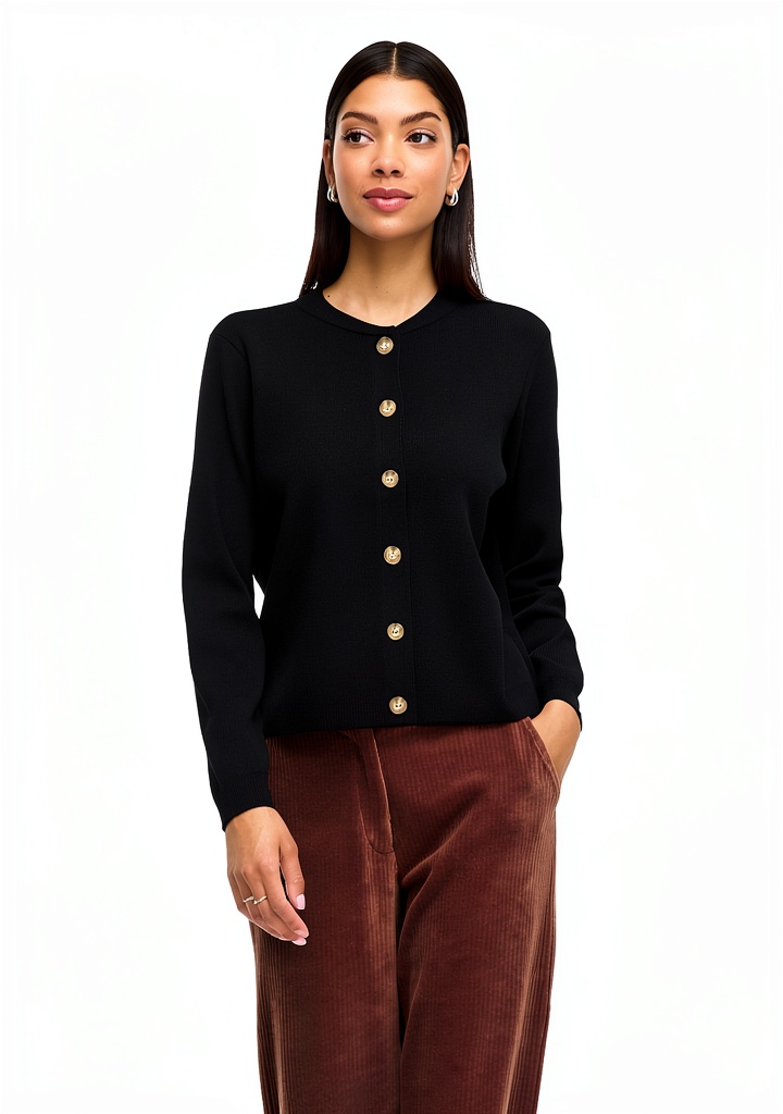 Il cardigan è realizzato con tessuti morbidi e resistenti, studiati per garantire comfort e facilità di manutenzione, ideali per un uso frequente.